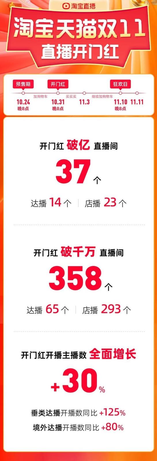 這屆雙11變了,店播成為新方向。近日,淘寶直播發(fā)布雙11直播開門紅戰(zhàn)報。戰(zhàn)報顯示,37個直播間成交破億,其中達播14個、店播23個,358個直播間成交額破千萬,其中達播65個、店播293個。圖源:淘寶直播不難看出,相較于達播,店播在淘寶直播的表現(xiàn)要亮眼許多。此前天貓開賣…