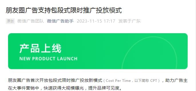 11月15日消息,微信近日宣布朋友圈廣告首次開放包段式限時推廣投放新模式(Cost Per Time,以下簡稱CPT),助力廣告主在大事件營銷中,快速獲得大規(guī)模曝光,提升品牌可見度。圖注:微信近日宣布朋友圈廣告開放包段式限時推廣投放新模式(CPT)圖源:微信廣告助手據(jù)介紹,…