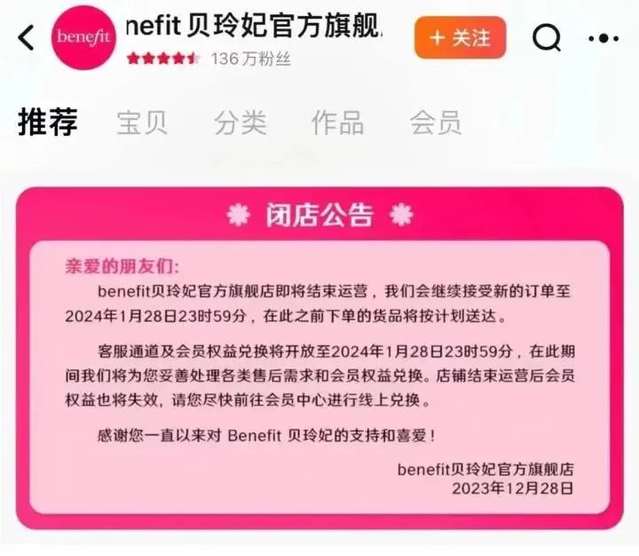 代變了,海外彩妝品牌已經(jīng)不吃香了。近日,美國(guó)彩妝品牌貝玲妃benefit在天貓、京東、抖音三大線上平臺(tái)發(fā)布公告,宣布其官方店鋪將于2024年1月28日23時(shí)59分起停止運(yùn)營(yíng),不再接受新訂單。同時(shí),客服服務(wù)和會(huì)員權(quán)益兌換也將同步關(guān)閉,所有會(huì)員權(quán)益將失效。圖源:淘寶App截圖…
